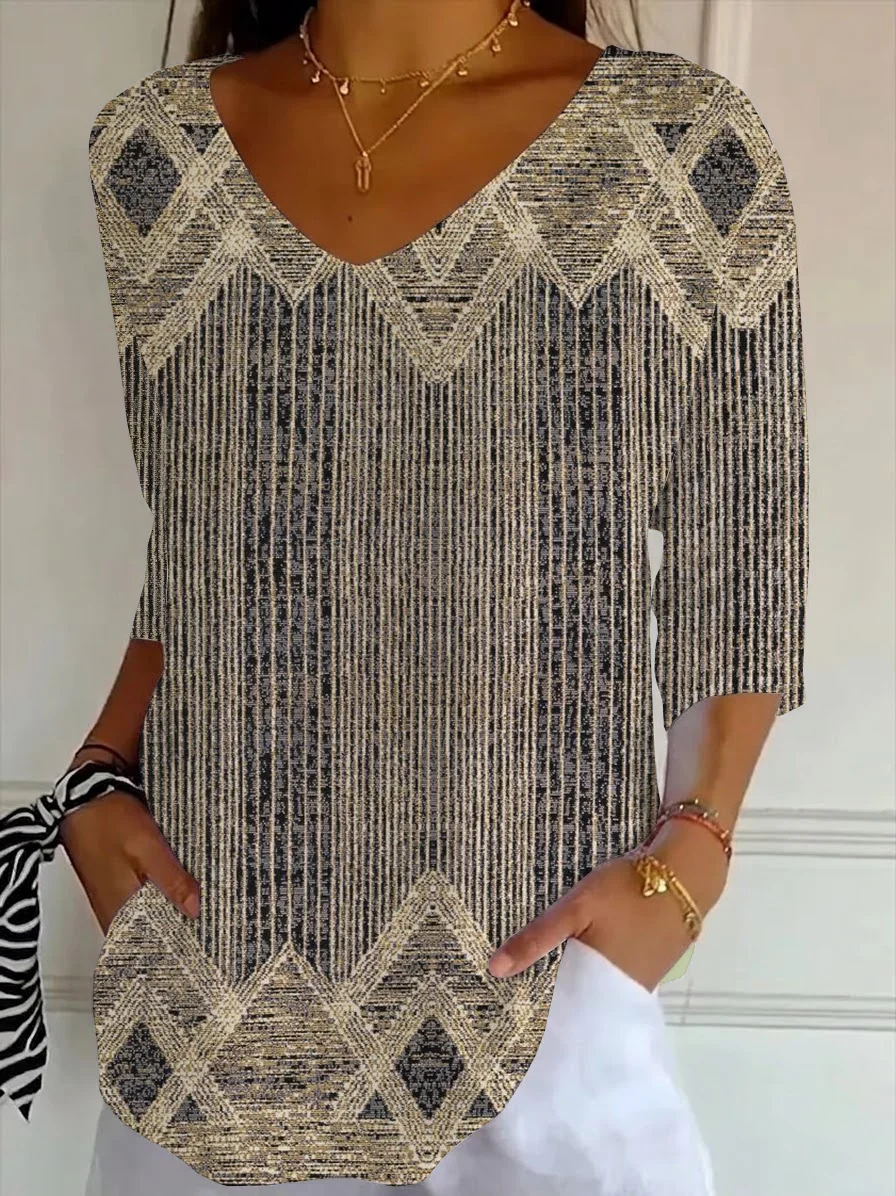 Women Abstract Three Quarter Sleeve Tee T-shirt V Neck Printing Casual Graphic Tee Spring/Fall Top