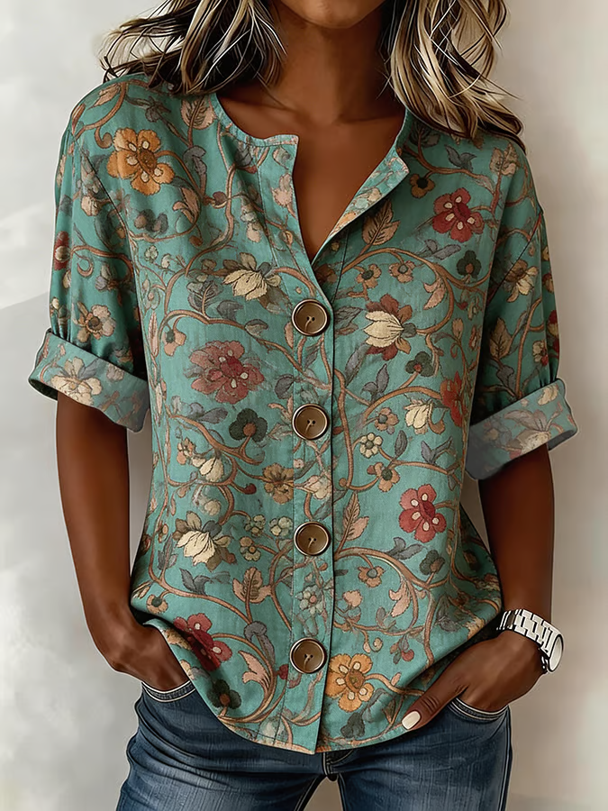 Women Floral Stand Collar Long Sleeve Shirt Buckle Casual Daily Spring/Fall Top
